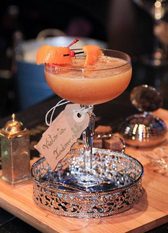 Batir enérgicamente hasta enfriar y homogeneizar y colar en una copa cocktail, añadir al final las gotas de bitter chocolate. Decoración: tirabuzón de naranja y cereza roja.
